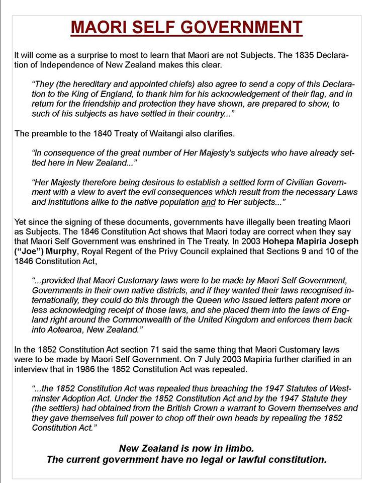 Australia and New Zealand governments illegitimate Allodial title constitutes ownership of real property All peaks sacred AJHR_1947_I_I-11 Common Law CIA world fact book Chapter 10ifparliamentwants toremainsoveregn Bill of rights 1990 crownremainsobligated coup d Corporation Constitutional monarchy is a form of democratic government in which a nonpolitical monarch acts as head of state within the boundaries of a constitution DRIPS_en Doctrine of discovery papal bull Defacedseal and bill of rights David Williams radical abo tittle and maori custom f2da0816baf Exclusive Economic Zone and Continental Shelf Environmental Effects Act 2012 EEZ000004_Hearing Schedule for Hamilton as at 26 March Duram report attachment Helen Clarke non response Governor of New Zealand George Grey argued that the Constitution Act would place the Māori majority under the political control of the settlers freedom FOUNDATIONS OF THE CONSTITUTION Indigenous land rights Independence in the New Zealand flag debate HenryVIII-Fact-Sheet Henry VIII is Alive and Well and Living in New Zealand Maori Sovereignty Māori Affairs Committee Law Commission Maori Custom and Values in NZ law Indigenous Land Rights and the Declaration on the Rights of Indig New Zealand and the League Nats give in to Maori over rights declaration MarkPrebblecontinuityquestion