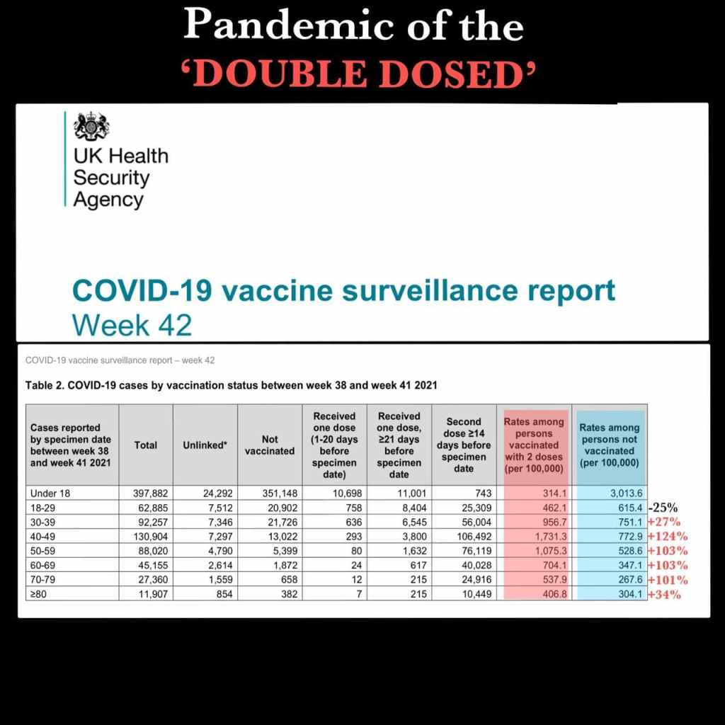 And in the 40, 50, 60 and 70 year-old age bracket, you are more than 100% MORE LIKELY to have Covid if youโve been โdoubly dosedโ.