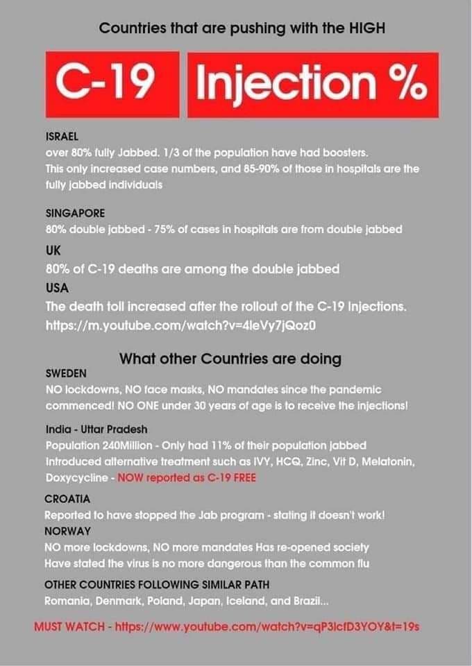 https://www.infowars.com/posts/watch-live-more-proof-surfaces-showing-fauci-lied-about-nih-funding-gain-of-function-in-wuhan/ Governments globally have used fear and your tax money to hurt you with his bio weapon yes the vax is a bioweapon and you have been tricked into taking it thinking you have done the right thing when what has really happened is you have taken a vax designed to kill you one way or another not only that but at present it is irreversible. Dont take it but look towards other treatments that are successful and working. The science is in these alternatives proven. Why would you take a vax that harms when they are available – oh that’s right because your government is fixated on the vaccination roll out and it must be done by Christmas!!!! It is also punishing those of us who did the research know the science and have said clearly and loudly NO. The question one asks at this is point is money worth my health (which will be short term thinking) without your health or worst case being alive only at the behest of taking their boosters whats money got to do with it. Do you know Pfizer made 155 billion dollars in a year of Covid just from Covid. While your job and money is threatened by false science. Without your health where will you be. Thankfully there are things coming down the pipe line that will provide solutions.