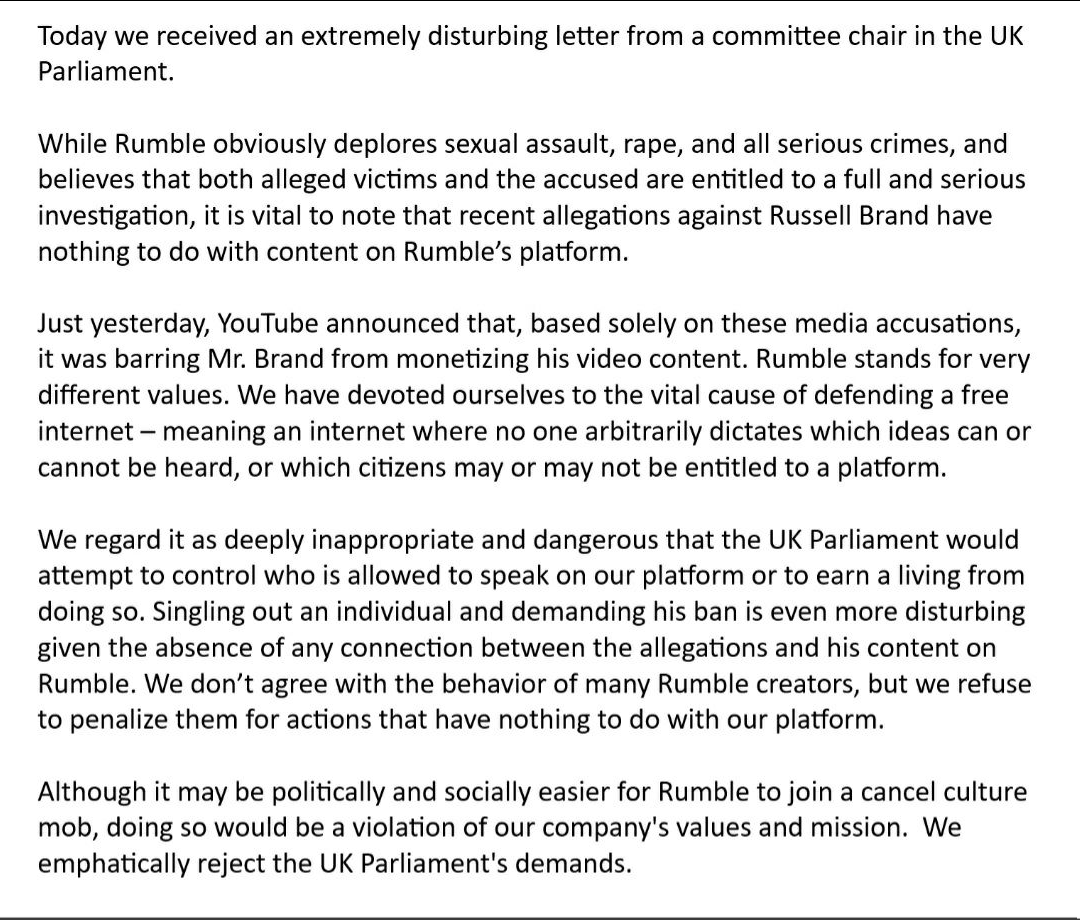 Rumble’s response to the UK Parliament asking the video sharing website to remove Russell Brand’s ability to monetize his channel.