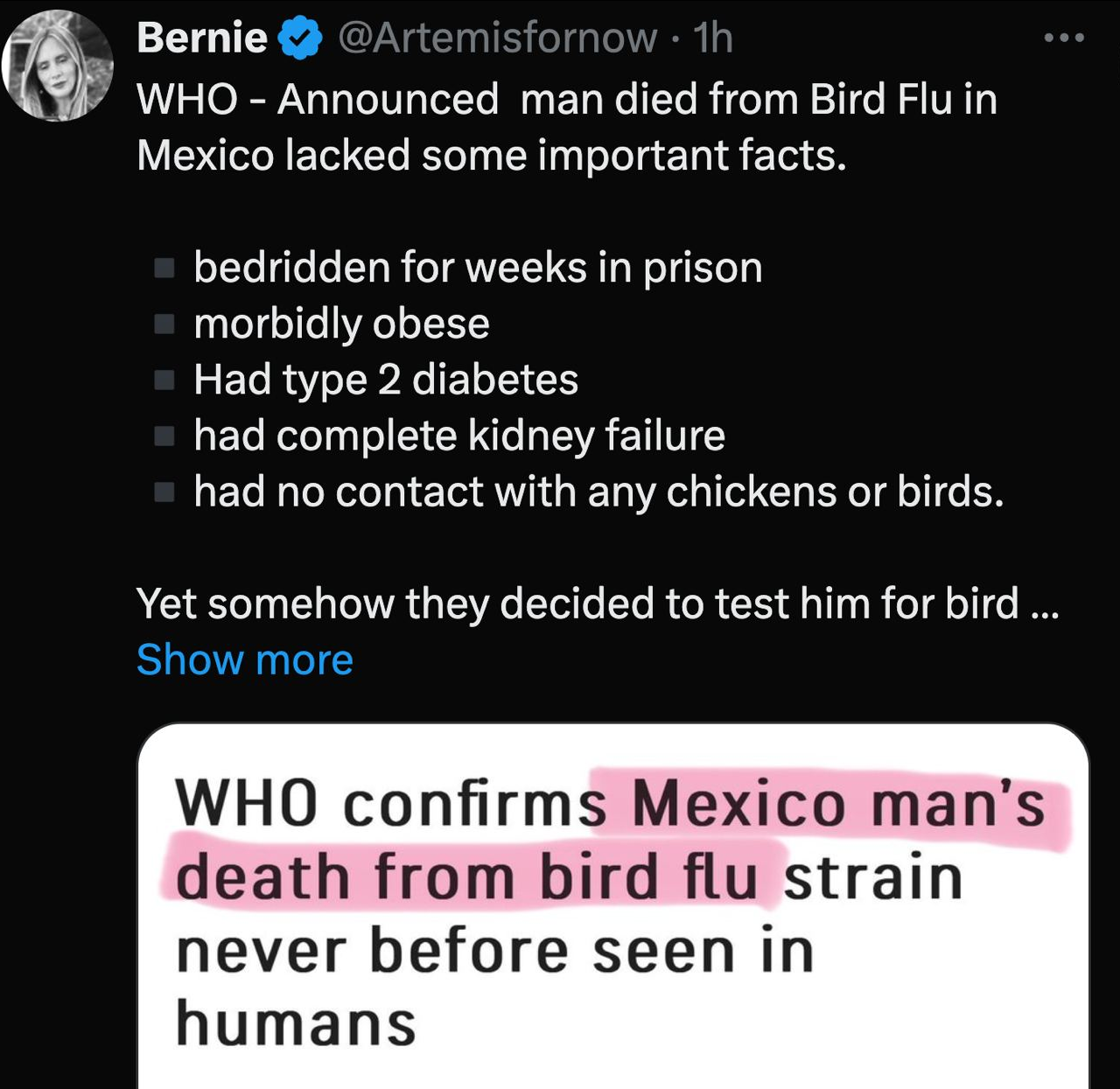 It is already established that the bird flu is man made and another bioweapon just as the Mnra injection is not a vaccine but a bioweapon being used to genocide (depopulate) humanity globally.