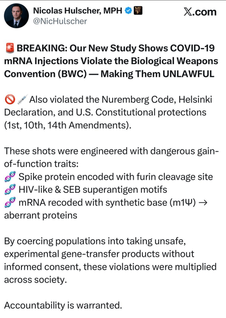 https://t.me/counterspin/5826 Newly published study confirms COVID mRNA injections violate the Biological Weapons Convention: