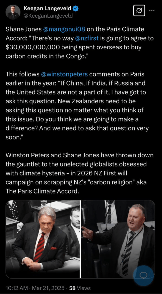 Winston Peters and Shane Jones have thrown down the gauntlet to the unelected globalists obsessed with climate hysteria – in 2026 NZ First will campaign on scrapping NZ’s “carbon religion” aka The Paris Climate Accord.