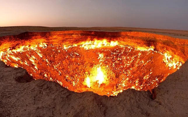8 Derweze, Turkmenistan, a burning natural gas fire in the middle of the Karakum Desert is known as the Door to Hell or Darvaza gas crater.