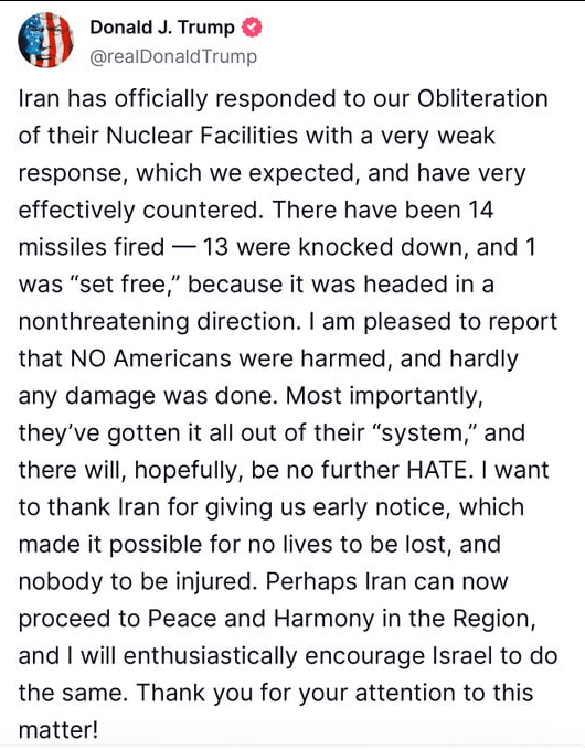 https://www.nzherald.co.nz/world/us-says-strikes-devastated-irans-nuclear-programme/AKVXG2NCPJAV7NSDKHIKD5ZMKI/ Trump poses why wouldn’t there be a regime change – Trump the regime chnage that is a must is Netanyahu but you know that already