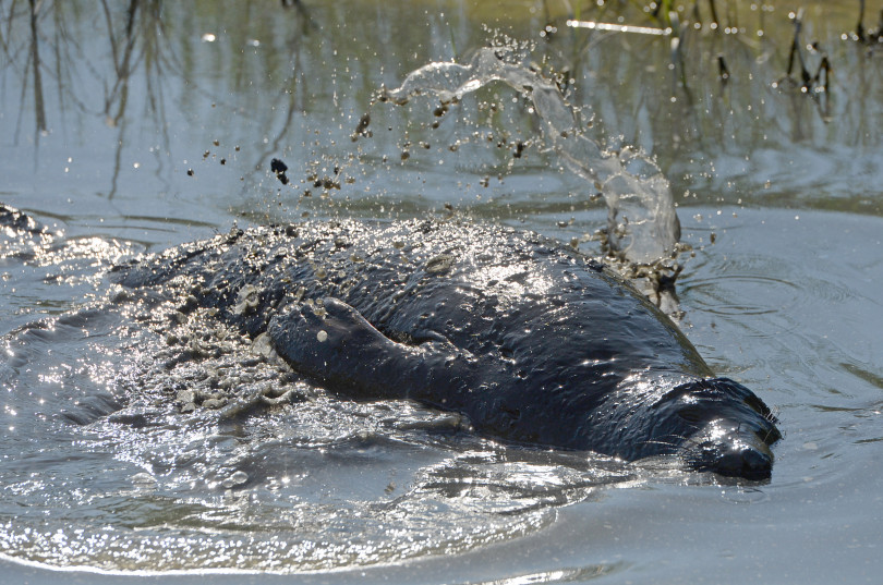 An elephant seal splashes mud on itself in Las Gallinas Creek near McInnis Parkway and Civic Center Drive in San Rafael on Tuesday afternoon. The pinniped eventually turned back towards the bay as the tide rose. (Alan Dep/Marin Independent Journal)